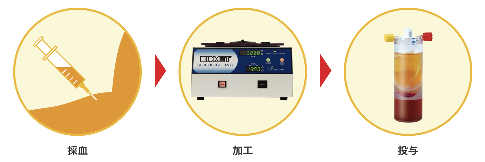 血液から血小板を濃縮して患部に直接投与することで、体の自然治癒力を後押ししようという発想です。