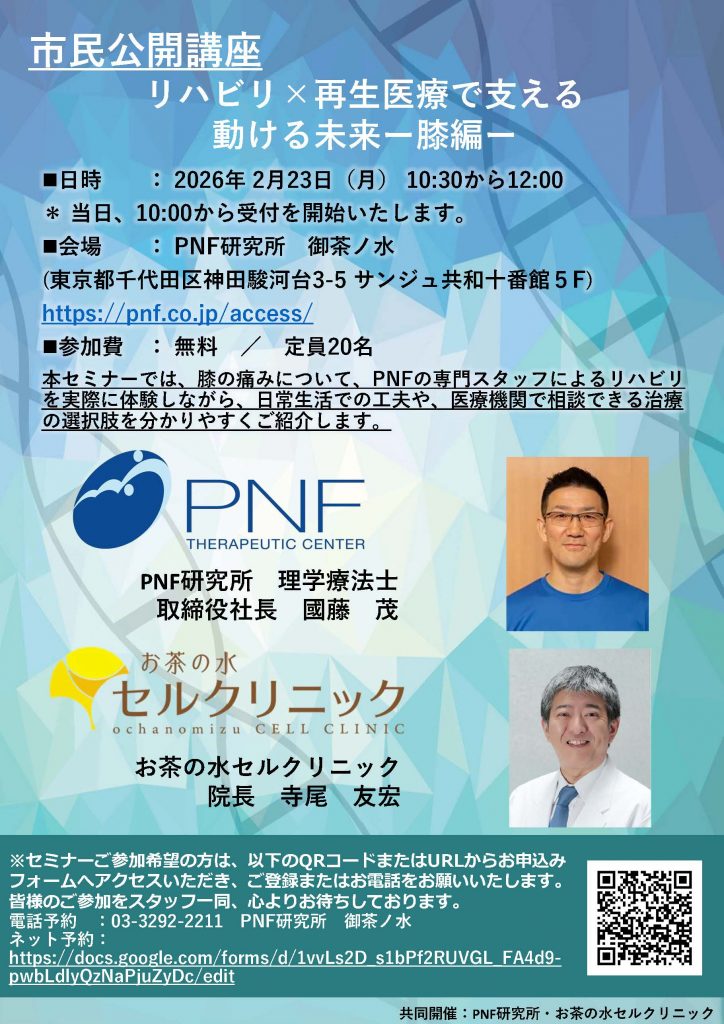 2月23日(月・祝日)に御茶ノ水にあるPNF研究所(リハビリ施設)×お茶の水セルクリニック合同で市民公開講座を行うこととなりました!
